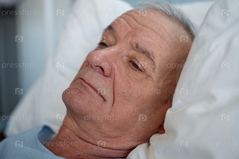 Отдыхающий пожилой человек в больничной постели, не глядя на камеру