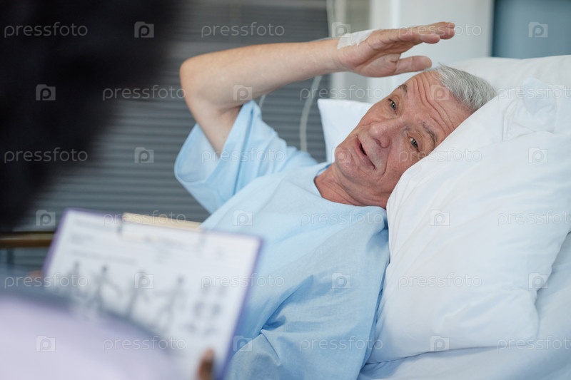 Пожилой мужчина восстанавливается в больничной постели, ярко улыбаясь