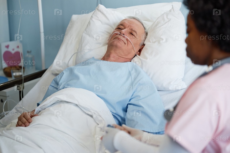 Старший пациент отдыхает в больничной постели с помощником поблизости