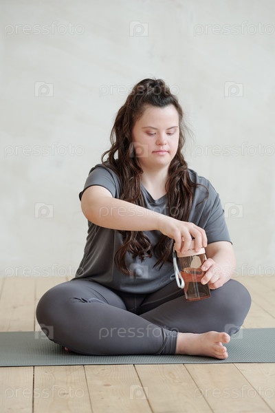 Молодая женщина-инвалид открывает пластиковое стекло водой