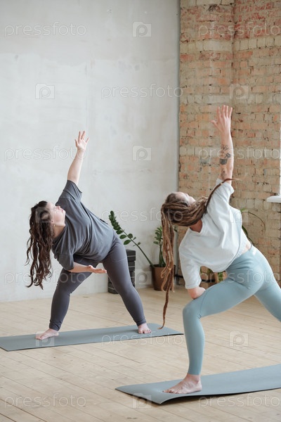 Тренер по йоге и девочка-инвалид делают одно из упражнений на йогу в спортзале