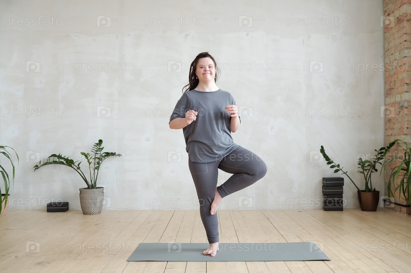 Молодая женщина в спортивной одежде, стоящая на одной ноге во время занятий йогой