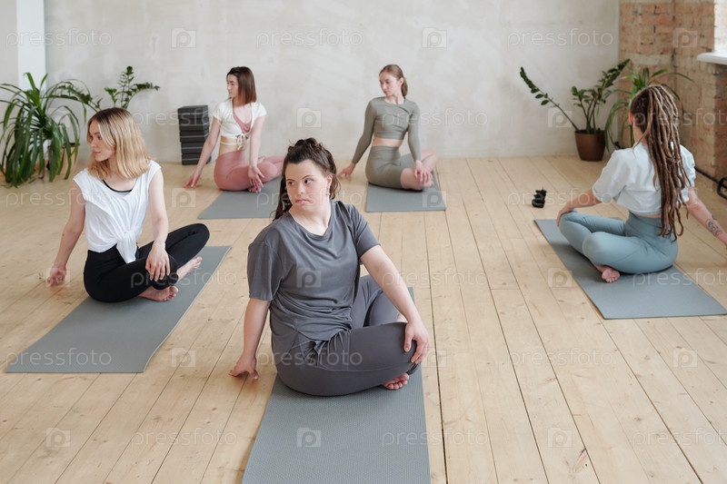 Женщины с пересеченными ногами, выполняющие упражнения по растяжению на ковриках