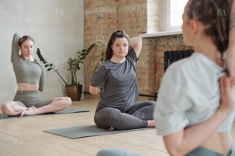 Две молодые женщины в спортивной одежде смотрят на тренера во время занятий йогой