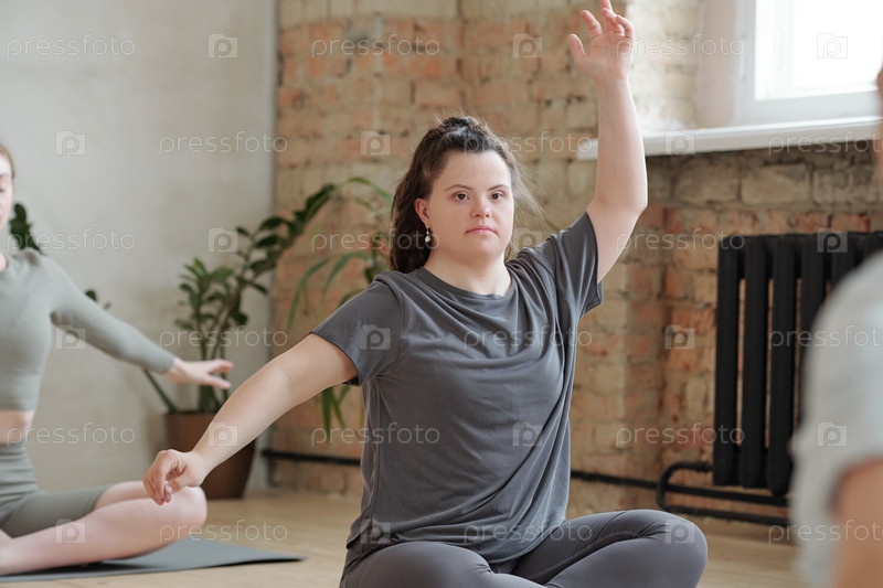 Инвалидная женщина в спортивной одежде повторяет упражнения по йоге после инструктора в тренажерном зале