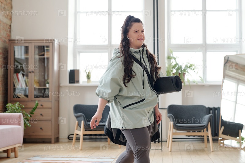 Девушка-инвалид с спортивной сумкой и ковриком уходит из дома в фитнес-центр
