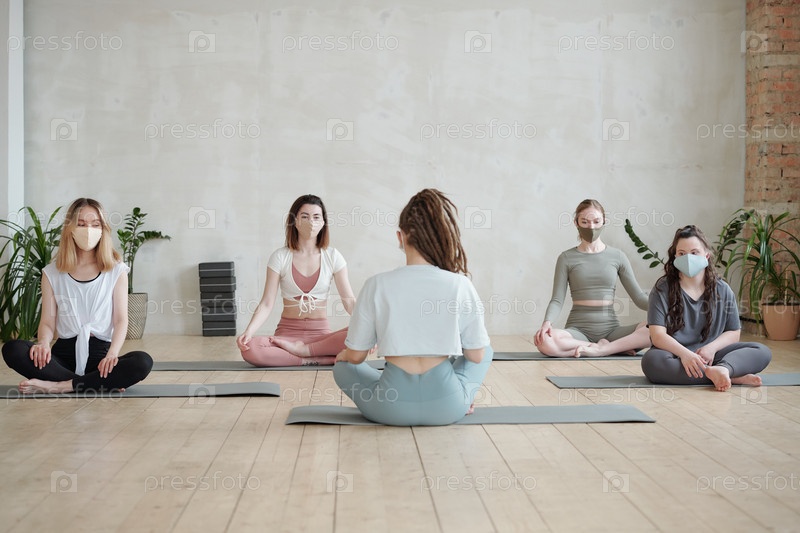 Девушки в масках слушают тренера, объясняющего новое упражнение в начале практики йоги