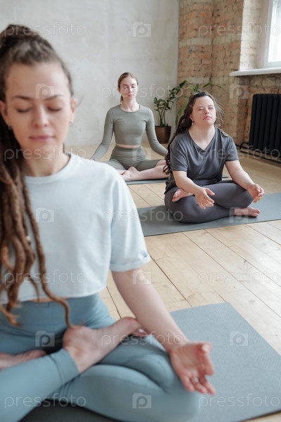 Инструктор и две молодые женщины, практикующие упражнения йоги