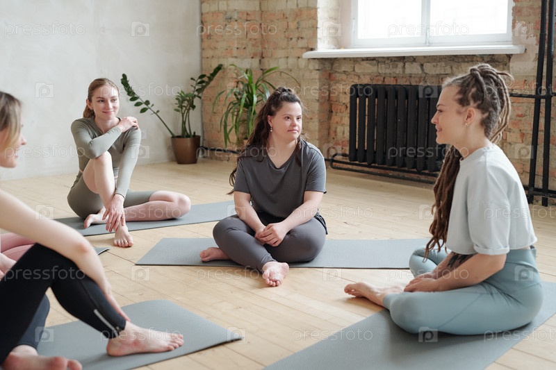 Молодая инструктор по йоге разговаривает со своими учениками после практики