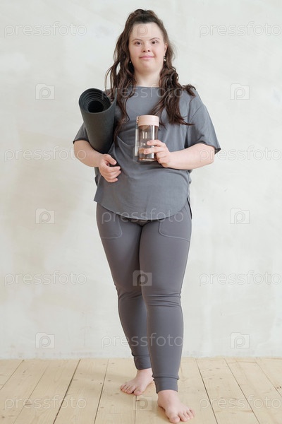 Молодая женщина-инвалид в спортивной одежде, держащая коврик и бутылку с водой