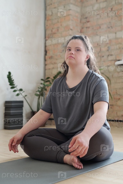 Молодая женщина-инвалид в спортивной одежде смотрит на тебя, сидя на матке