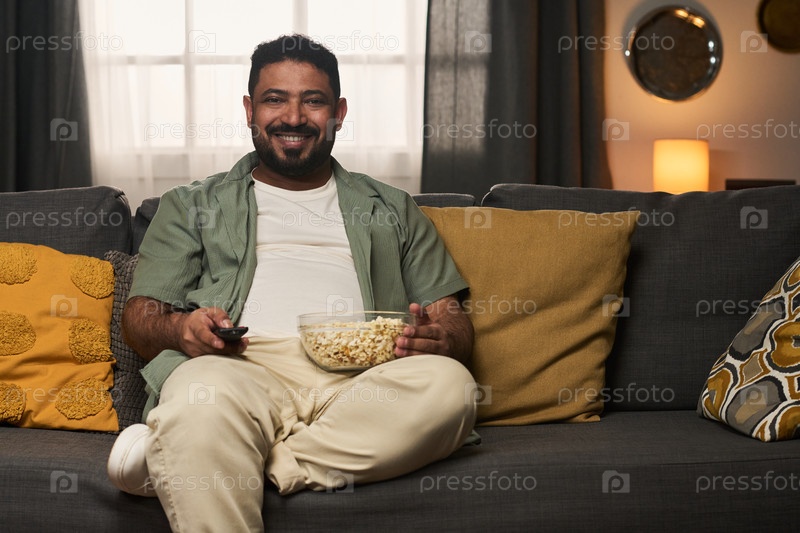 Улыбающийся мужчина держит миску попкорна, сидящий на диване