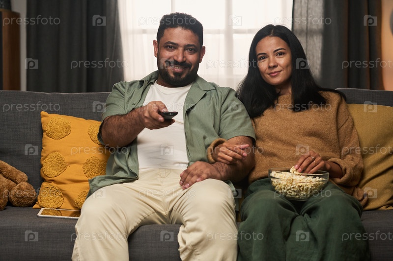 Пара отдыхает на диване и смотрит телевизор вместе