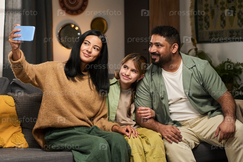 Семья делает селфи вместе на диване в гостиной