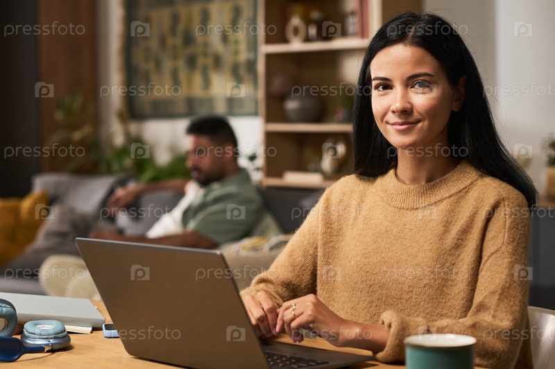 Портрет женщины, использующей ноутбук в уютной домашней обстановке