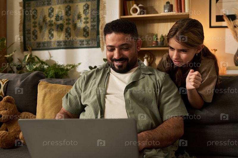 Мужчина и женщина улыбаются во время совместного использования ноутбука