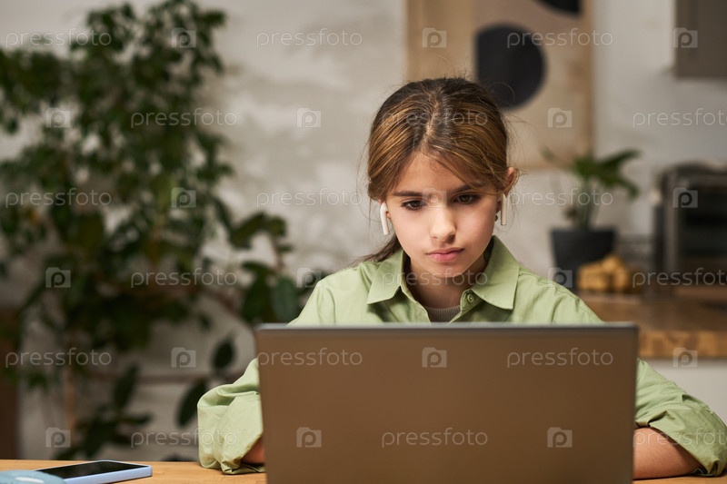 Концентрирующаяся молодая девушка работает на ноутбуке дома