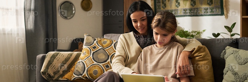 Мать направляет ребенка во время использования ноутбука дома