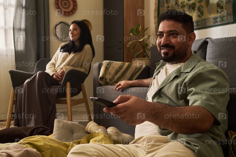 Пара отдыхает дома с пультом дистанционного управления в руке