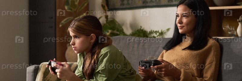 Молодые девушки сидят и играют в видеоигры на диване