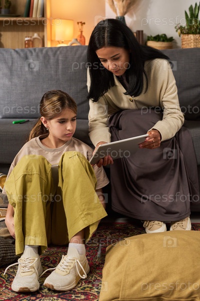 Мать и дочь используют планшет на полу в гостиной