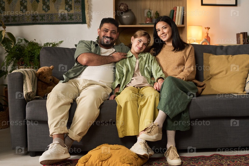 Улыбающаяся семья отдыхает вместе на уютном диване