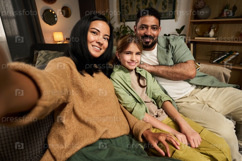 Улыбающаяся семья отдыхает на диване в гостиной вместе