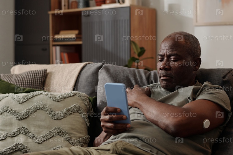 Африканский американец использует смартфон в уютной гостиной