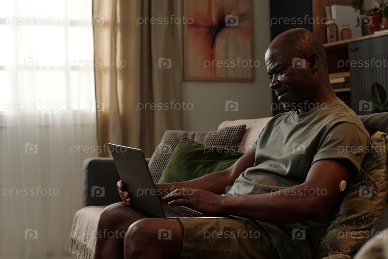 Улыбающийся мужчина средних лет сидит на диване и работает над ноутбуком