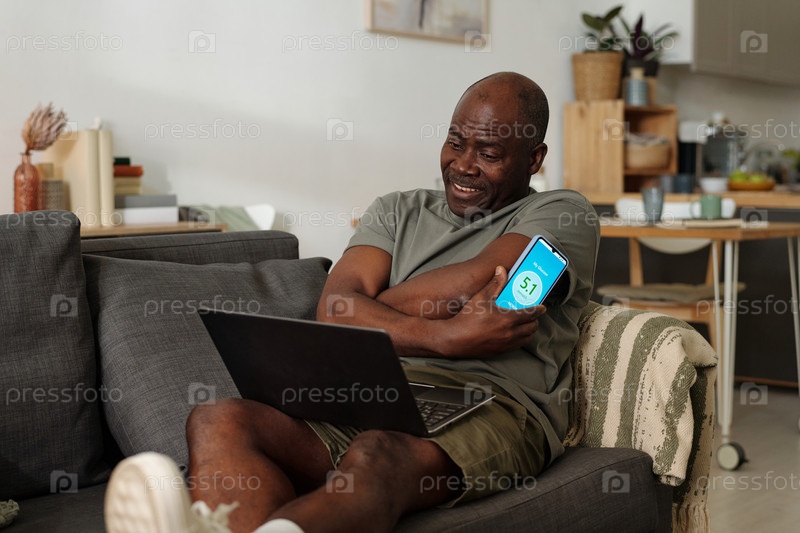 Африканский американец использует смартфон и ноутбук во время отдыха