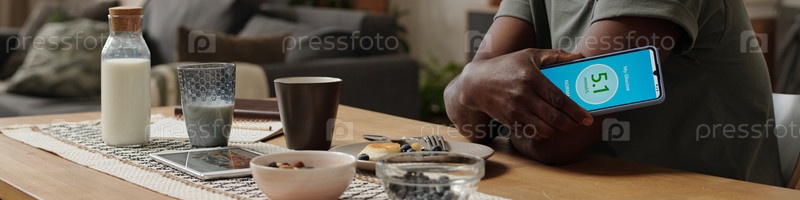 Проверка прогресса фитнеса на планшете за завтраковым столом