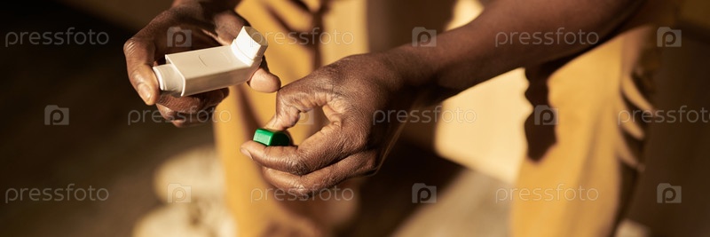 Мужчина держит ингалятор астмы и его крышку