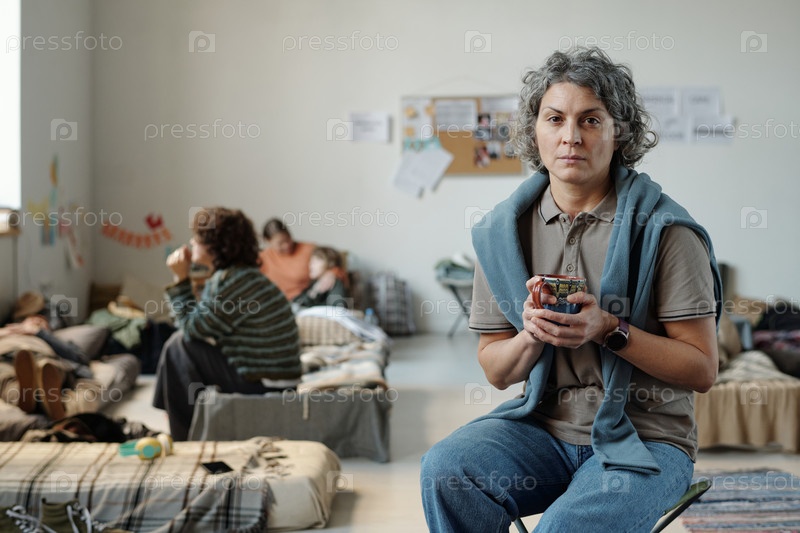 Зрелая беженка пьет чай в лагере