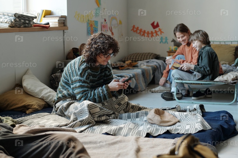 Беженец отправляет текстовые сообщения на мобильный телефон