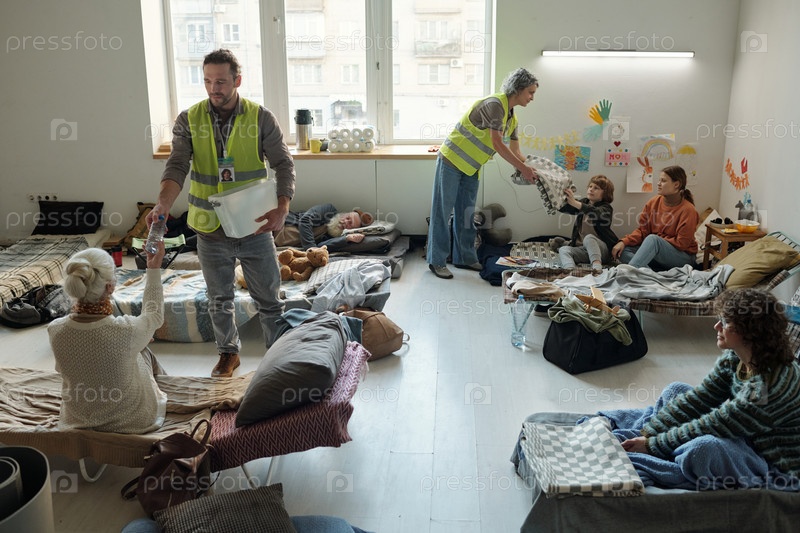 Передача воды и одеяла беженцам