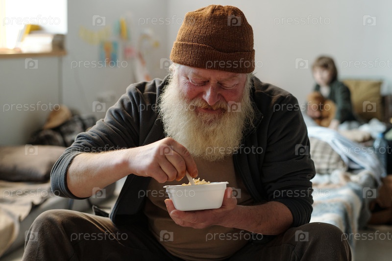 Улыбающийся старший беженец ест лапшу