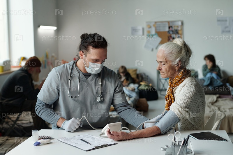 Врач в медицинской маске с использованием тонометра