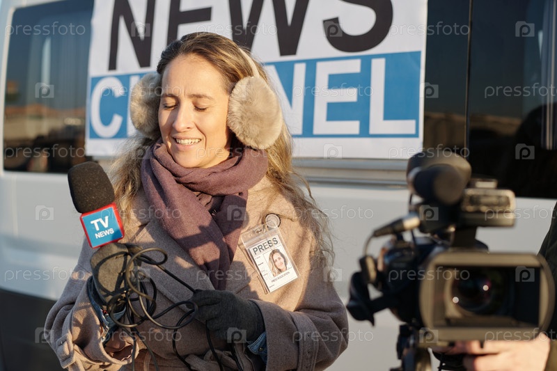 Репортер стоит перед телевизионным фургоном