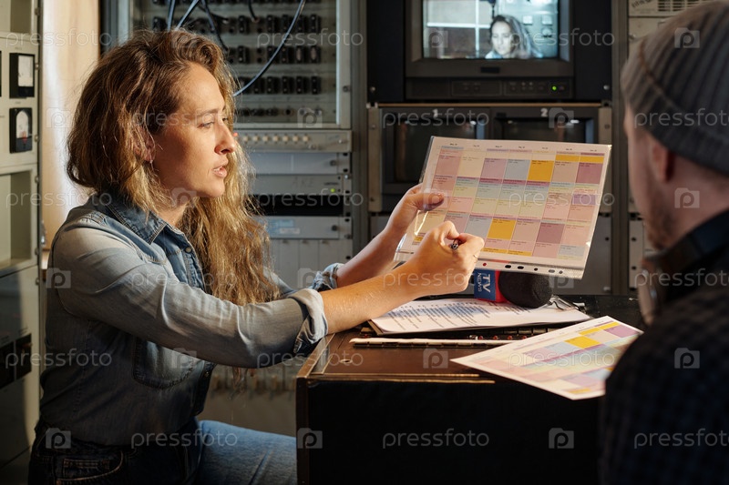 Женщина, указывающая на стол с графиком