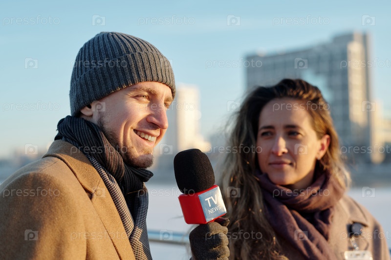 Мужчина говорит во время интервью на открытом воздухе