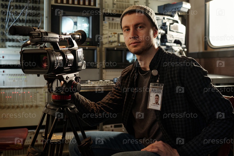 Оператор сидит у рабочего места в телевизорном фургоне