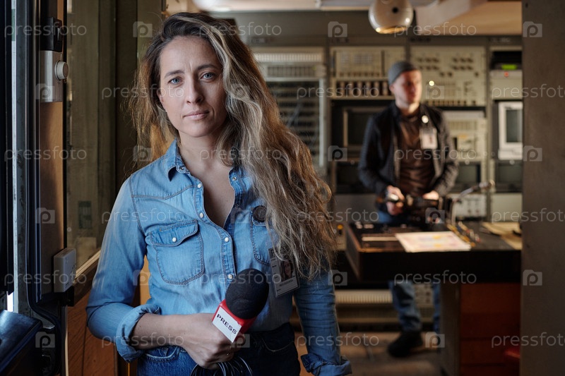 Молодой уверенный в себе журналист с Майк