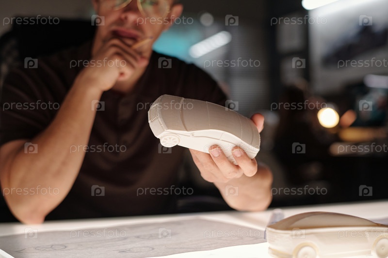 Дизайнер, держащий белую модель автомобиля Мужчина