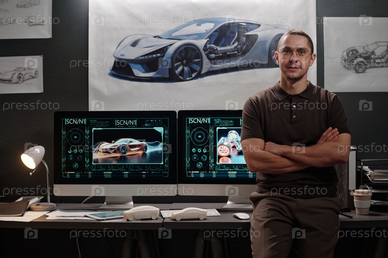 Счастливый молодой дизайнер автомобилей в офисе