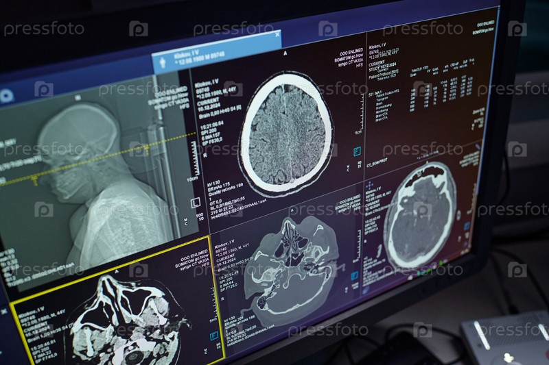 Отображение снимков сканирования мозга на экране компьютера в лаборатории радиологии