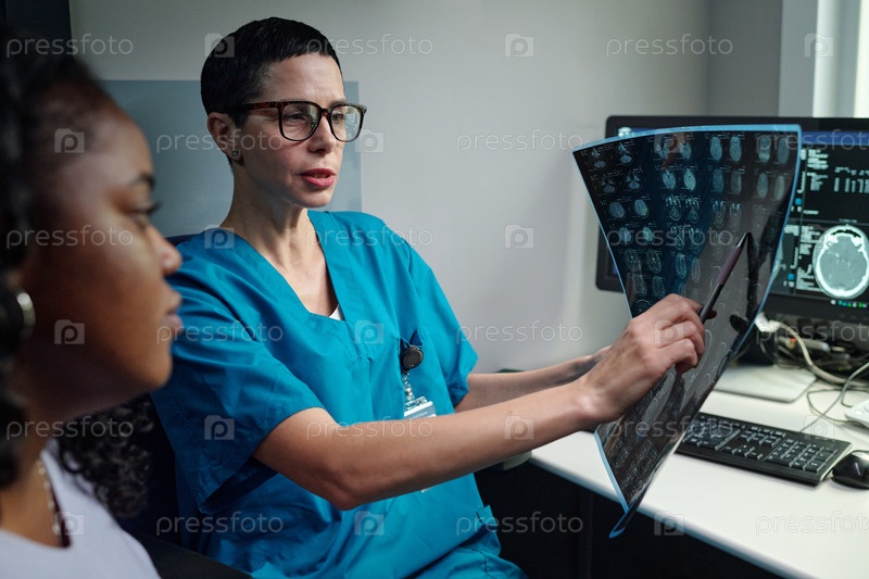 Профессиональный врач, анализирующий сканирование мозга с присутствием пациента