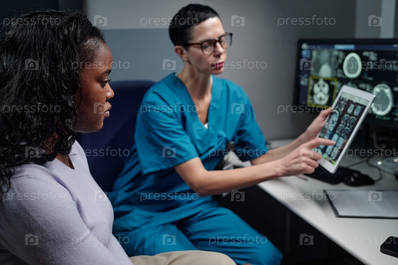 Медсестра объясняет медицинские изображения обеспокоенному пациенту