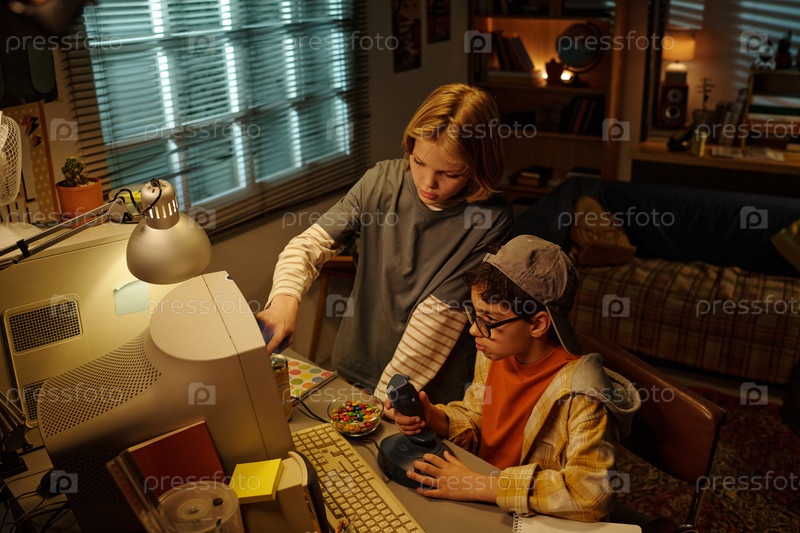 Дети играют с винтажным компьютером в тускло освещенной комнате