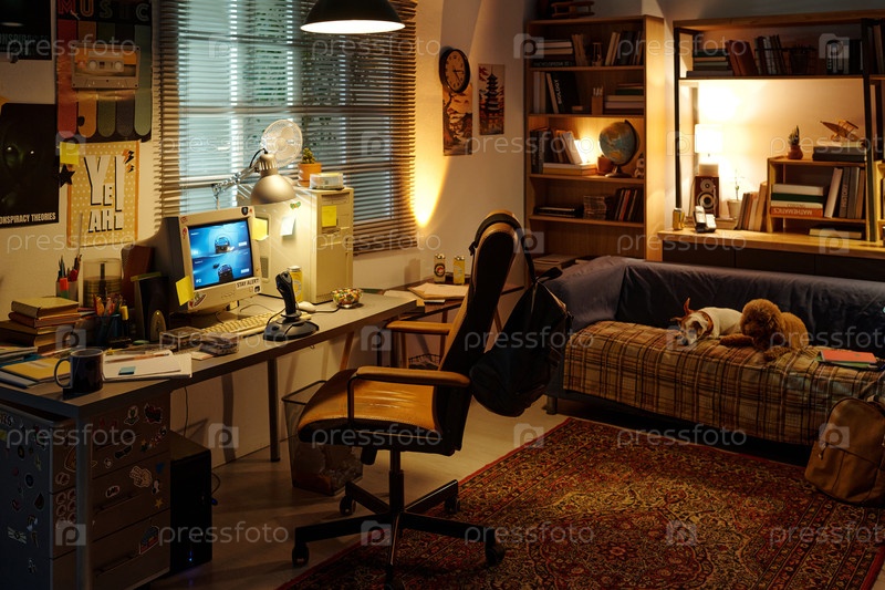 Уютный домашний офис во время вечернего освещения рабочей зоны