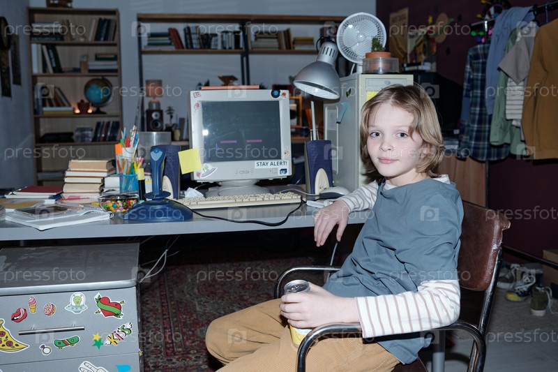 Портрет ребенка, сидящего за столом в домашнем офисе